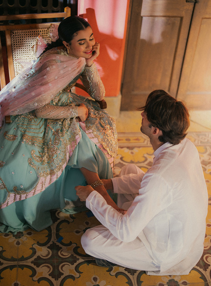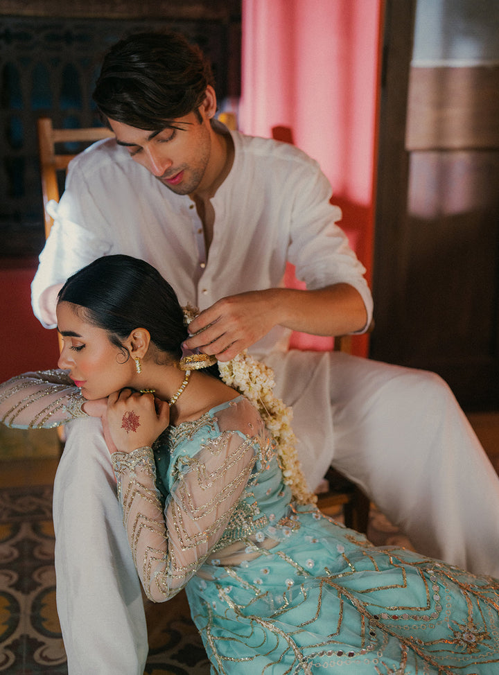 - Embroidered, sequinned and hand embellished front Yoke (Net)