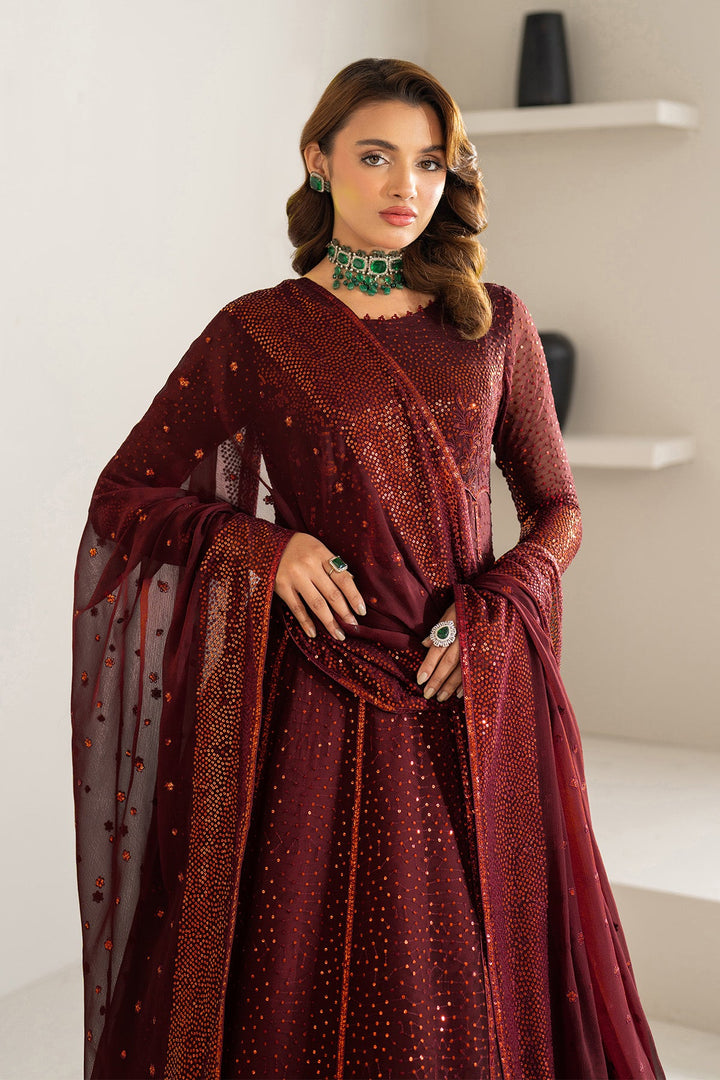 "Liyana" in rich red features a stunning maxi with detailed gold embroidery on the front, back and sleeves, showcasing meticulous artistry and royal elegance. Paired with an embroidered chiffon dupatta, elevated with beautiful motifs that enhance the overall design, the ensemble is completed with matching tonal grip trousers.
