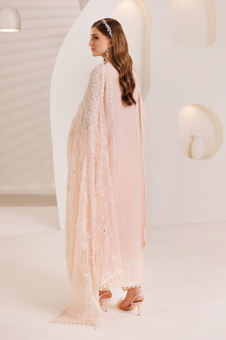 A pastel pink shirt adorned with intricate foil embroidery adds a subtle shimmer to the front, hem, and sleeves with delicate patterns. Paired with raw silk trousers and draped in richly embroidered chiffon dupatta featuring a finely detailed border, this is elegance that speaks softly, but stands strong.