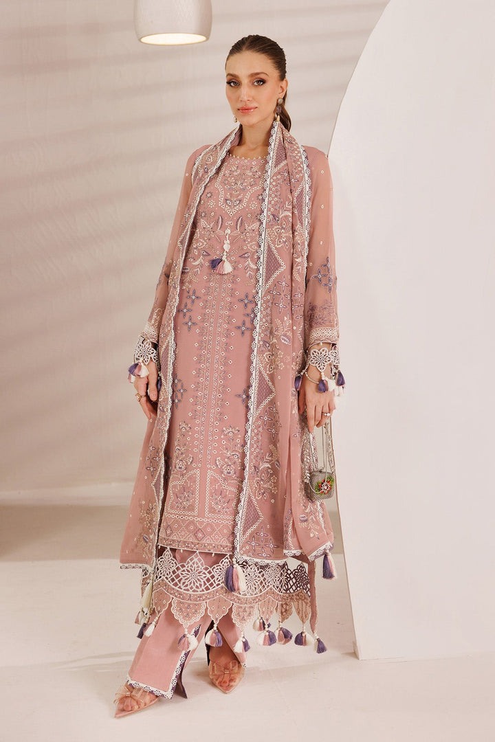 A peachy pink ensemble that radiates soft charm?hite and purple contrasting embroidery dances across the chiffon shirt, adorned with beautifully composed motifs, ?aired with an embroidered chiffon dupatta and tailored raw silk trousers, this look captures elegance in every detail.