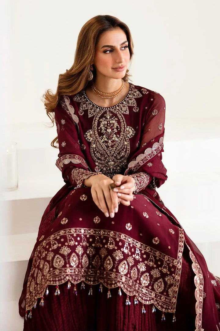Embroidered Front/Back & Sleeves Chiffon?br>Embroidered Dupatta Chiffon?br>Embroidered Back & Sleeves Motif Organza (3 Pcs)?br>Embroidered Front & Back Daman Border Organza?br>Embroidered Front/Back Chalk Sleeves & Neck Patti Organza?br>Dyed Russian Crushed Trouser?br>