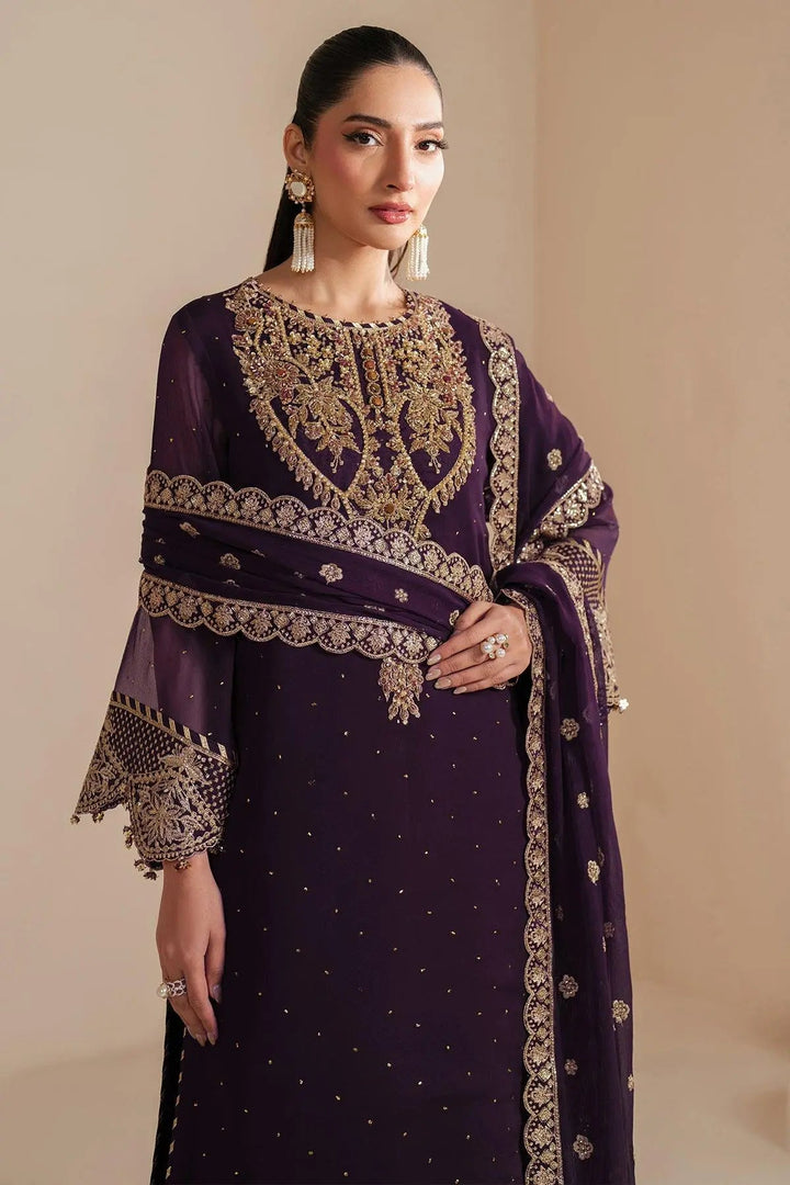 Sirus is a stunning ensemble made from rich deep purple chiffon, adorned with delicate hand embellishments, intricate embroidery, and shimmering light gold sequins. The look is complemented by russian grid trousers featuring an embroidered border, perfectly balancing the opulence of the chiffon dupatta. This exquisite outfit is the perfect choice for Eid celebrations.