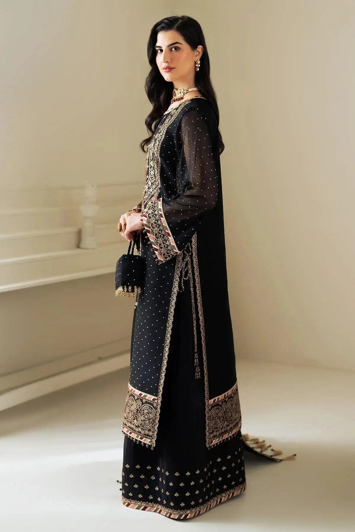 The "Alba" ensemble is a captivating ensemble featuring a black chiffon shirt with a beautifully embroidered neckline, adorned with a stunning array of intricate pearl embellishments for a touch of luxury. The look is completed with an embroidered chiffon dupatta, displaying floral patterns and delicate, complementary-hued embroidery. Paired with tonal raw silk trousers, this ensemble is the perfect choice for an unforgettable festive season.
