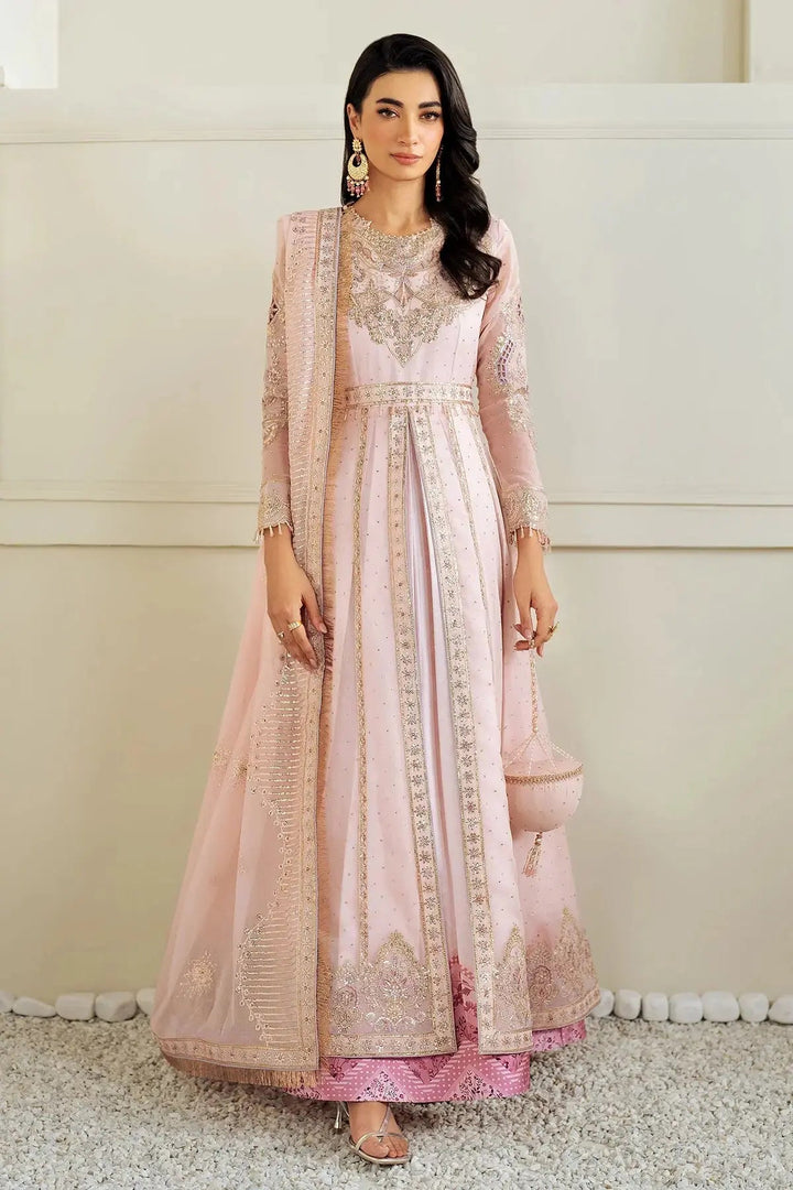 ?zna?/strong> is an exquisite premium chiffon pastel pink ensemble adorned with intricate gold embroidery and shimmering details adding a contemporary twist, while the embroidered chiffon dupatta and raw silk tonal trousers, adorned with delicate floral motifs, perfectly complete the look.