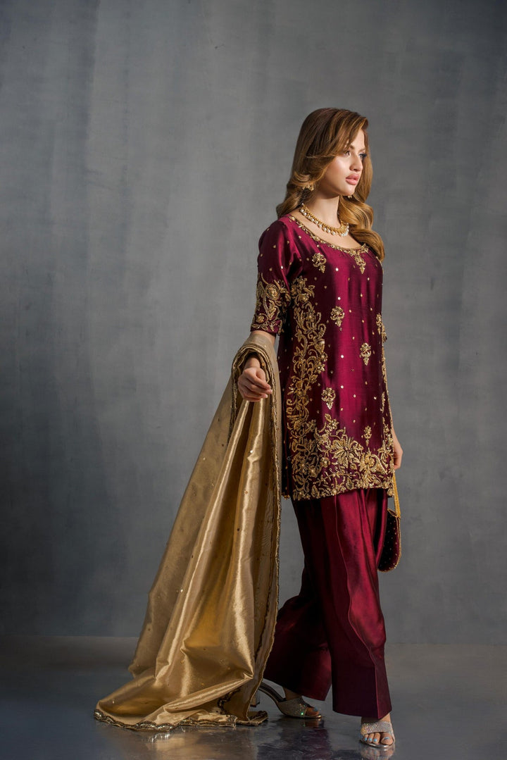 This dreamy outfit is a new staple for the wedding season. Delicate dabki, nakshi and zardozi kaam is complemented with a lama tissue scalloped worked dupatta. Classic silk farshi pants complete the outfit.