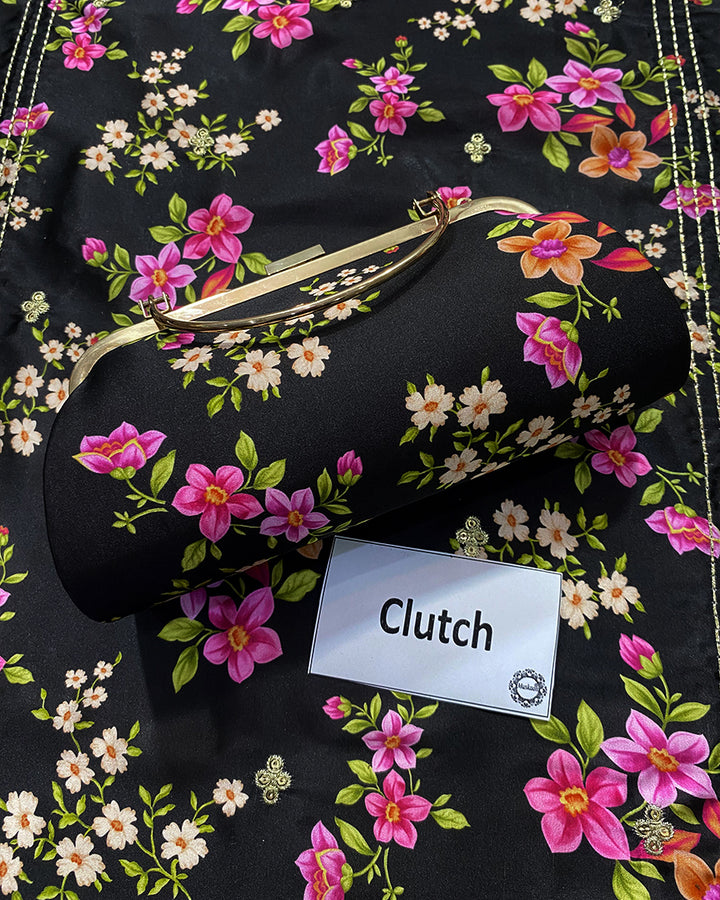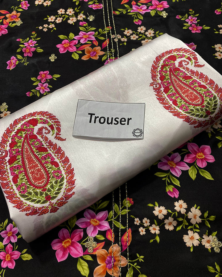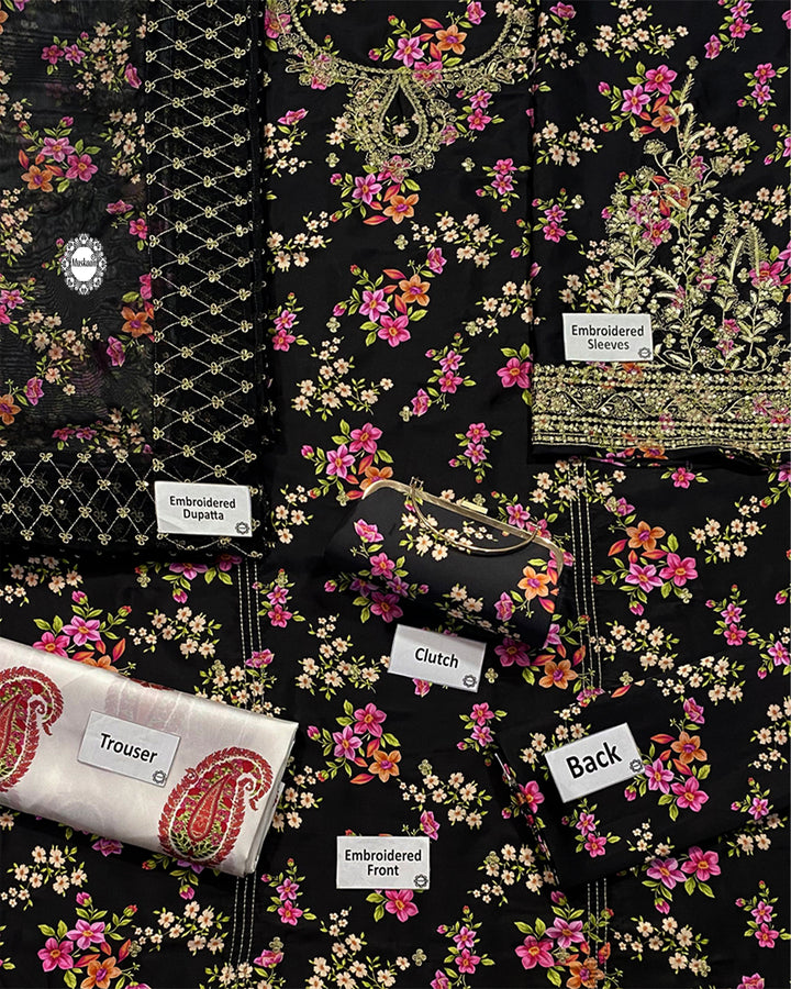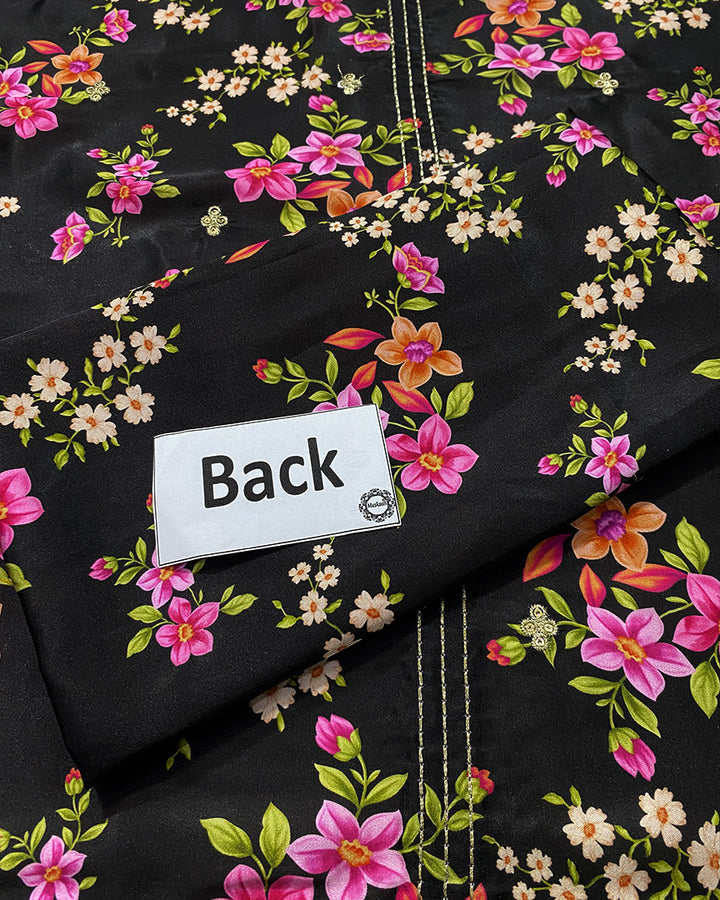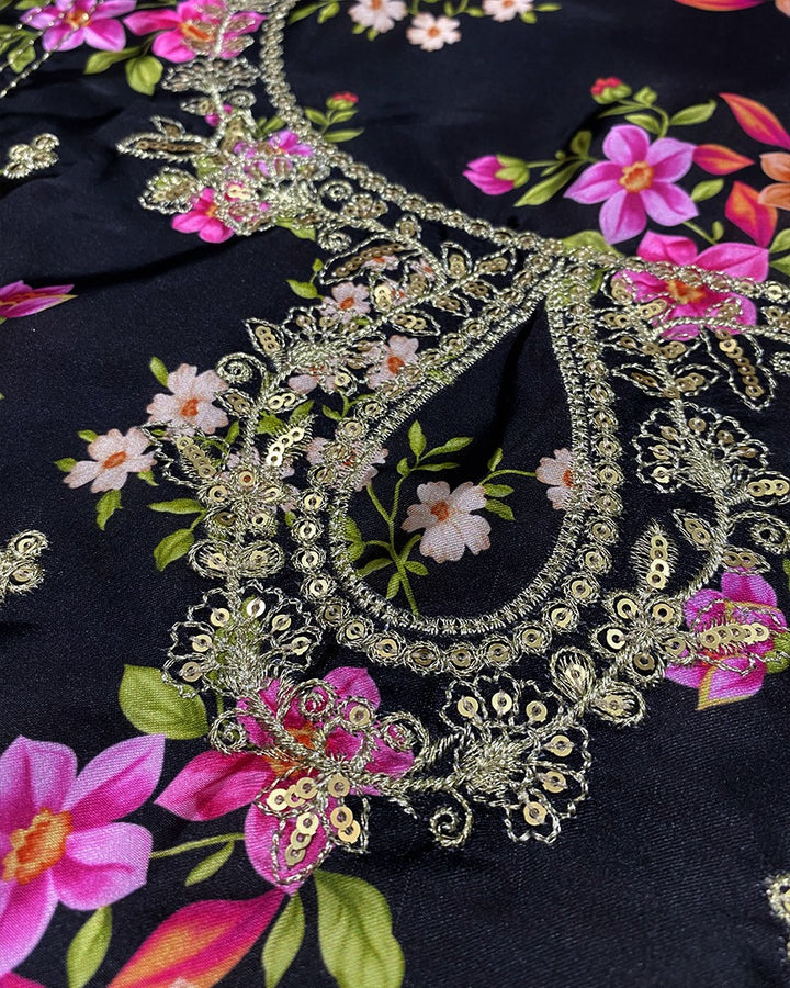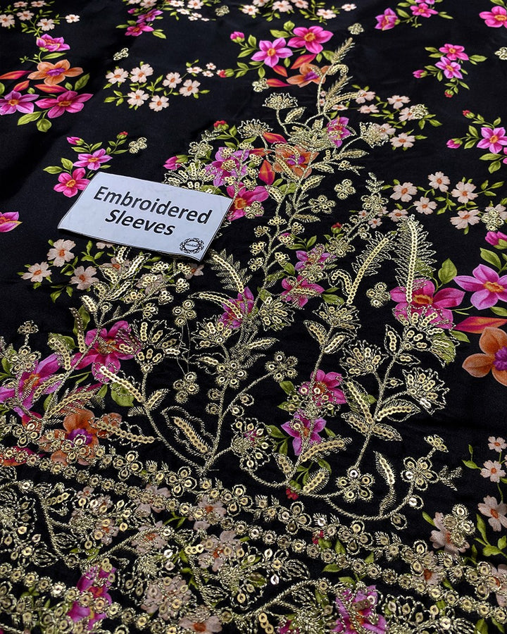 This printed panelled black lawn shirt is designed with delicate embroidery at the neckline and features a sequin spread at the front, creating a beautiful blend of texture and sparkle. The embroidered sleeves add an extra layer of elegance, making the shirt both stylish and intricate.