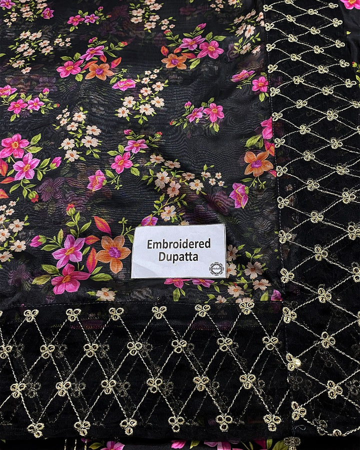 A printed organza dupatta with sequin embroidery on all four sides completes the ensemble, adding a refined shimmer and a graceful finish to the look.