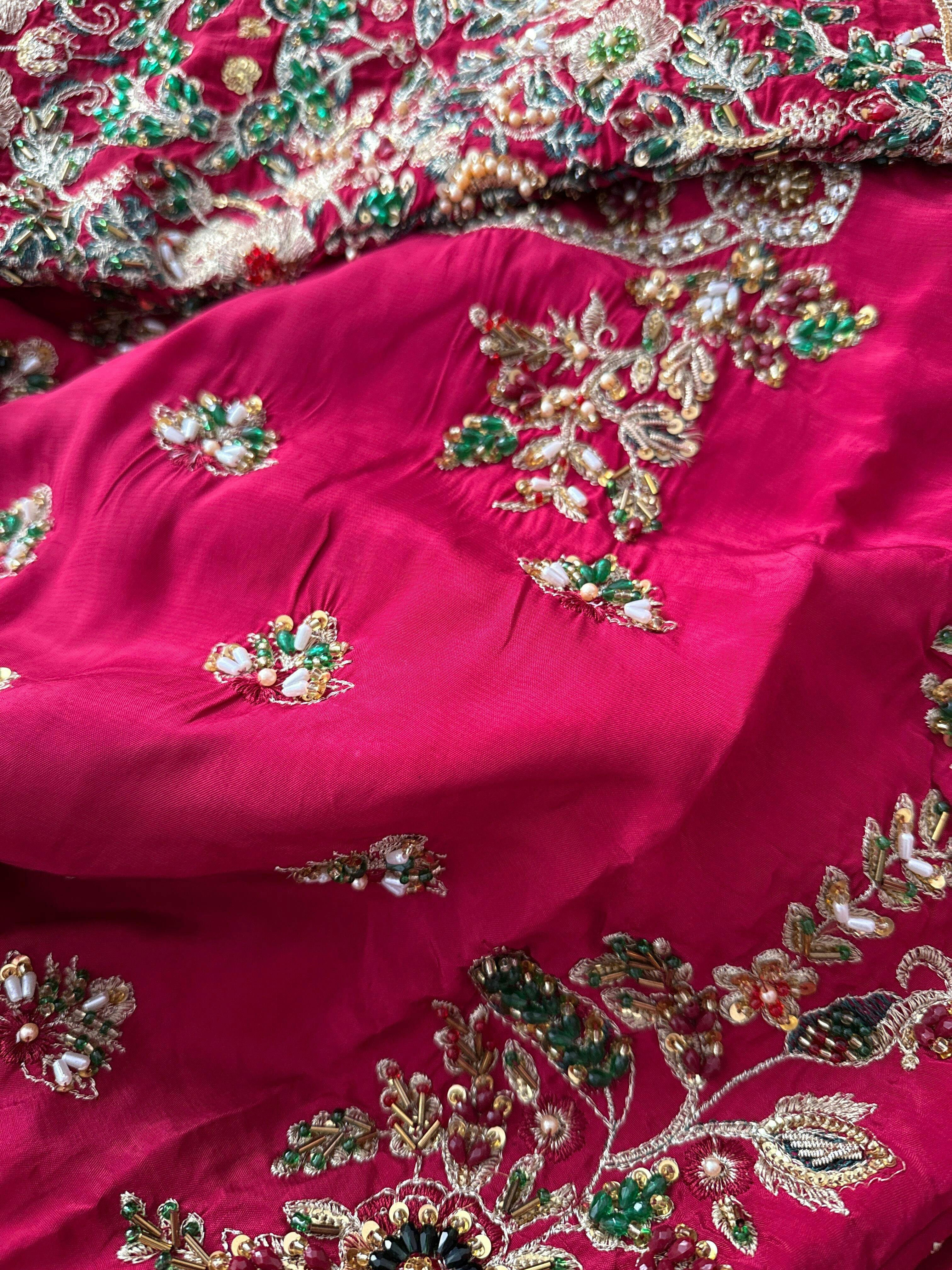 Burgundy Dusk features a meticulously crafted organza net shirt in a rich plum hue. Adorned with intricate kora, dabka, resham, gotta, and sequence work, the delicately hand-embellished sleeves and daaman exude timeless charm. Dreamy blooms in single dhaaga, gota, and zardozi enhance its classic appeal. Paired with an emerald, green pure organza dupatta embellished with sequins spray and floral motifs, and silk izaar pants with heavily detailed borders.