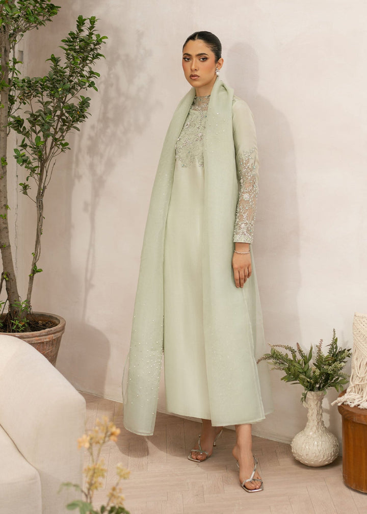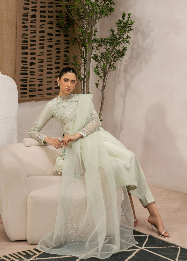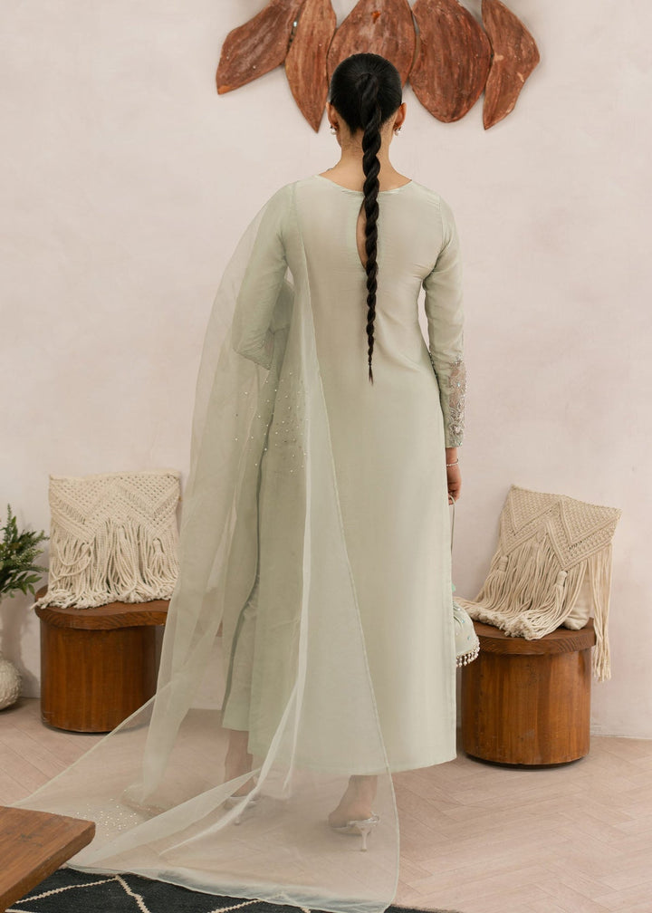 Fresh and radiant, this apple green ensemble is crafted from tissue silk for both shirt and trouser. The organza dupatta adds a breezy finish, making it a perfect choice for daytime festivities and your celebrations.
