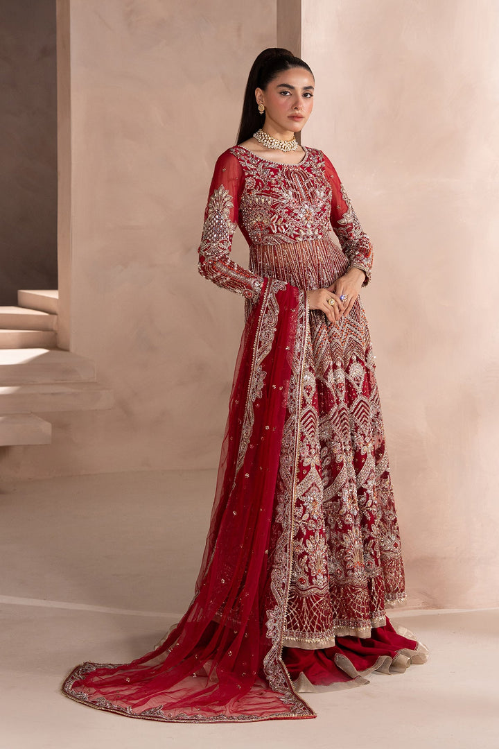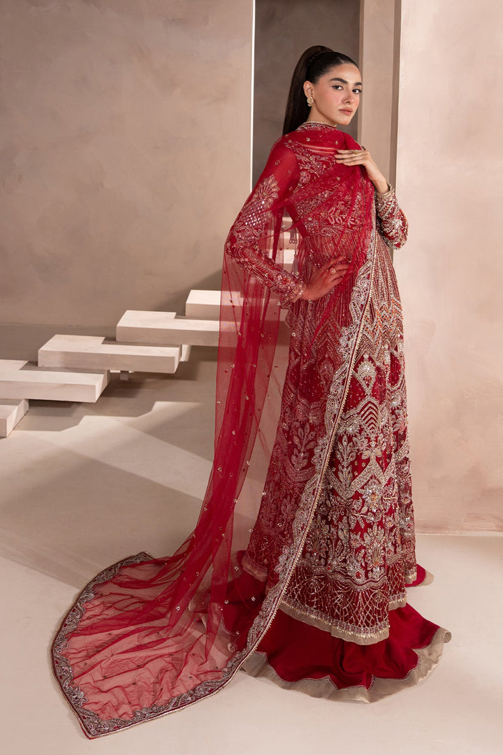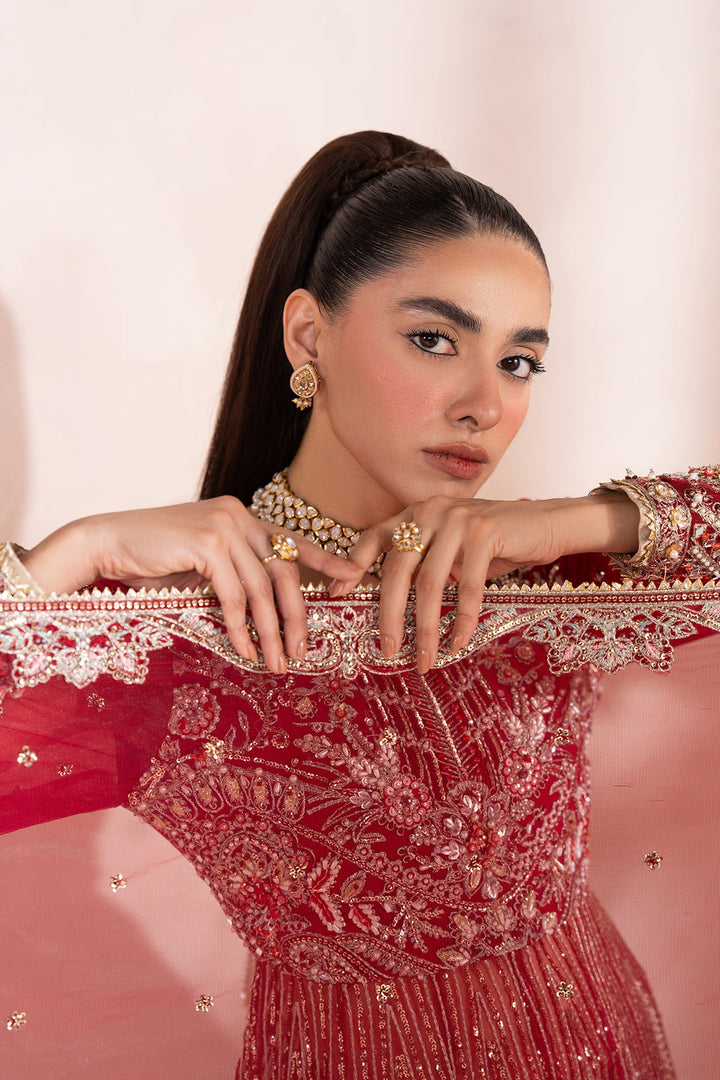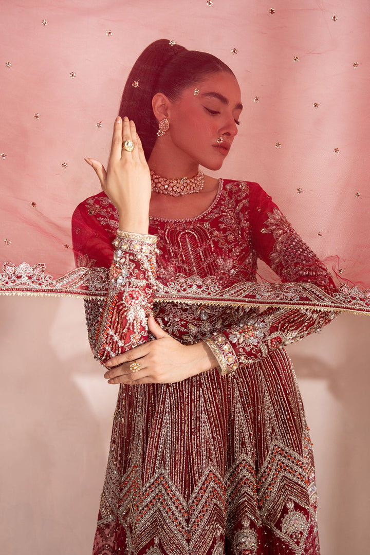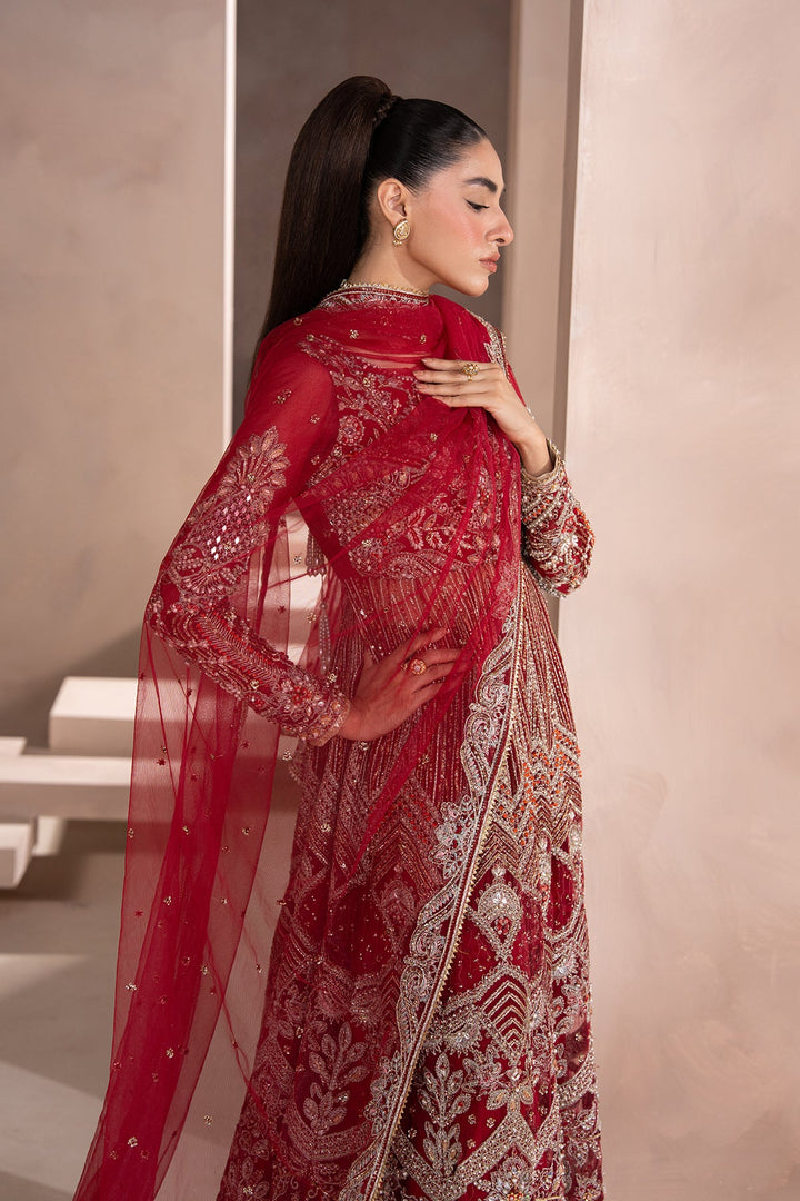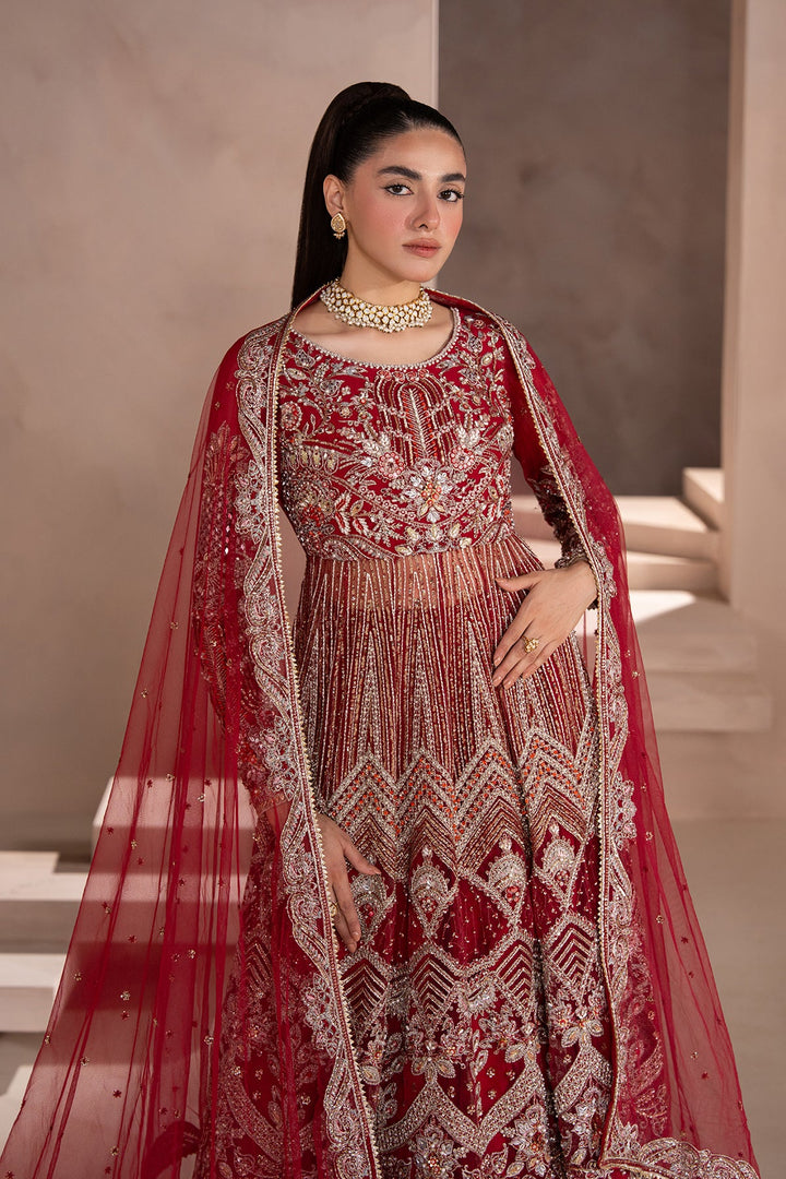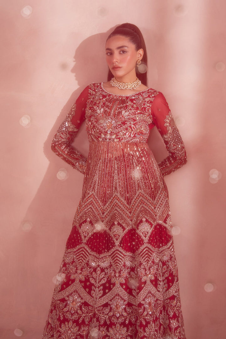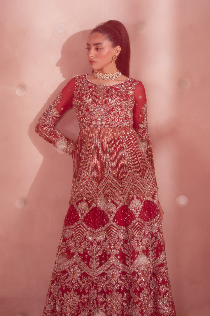 - A Stunning Red and Silver Pishwas-style outfit with gold-embellished modern floral motifs. Paired with a wide-legged Sharara featuring subtle gold highlights, and a sheer net dupatta edged with delicate floral detailing. A perfect blend of regal tradition and modern elegance.