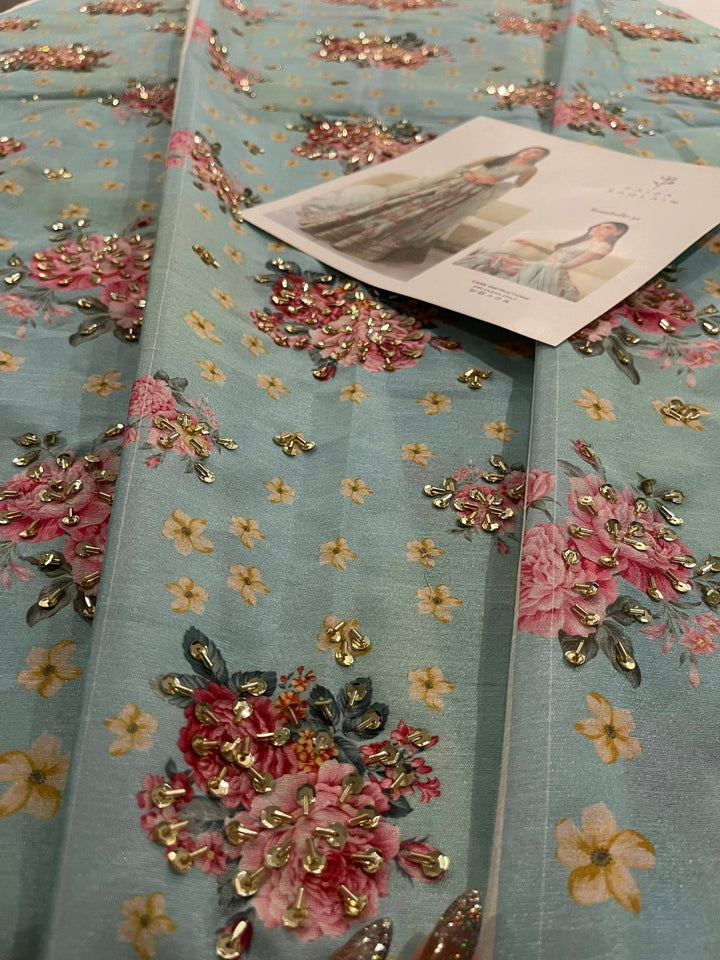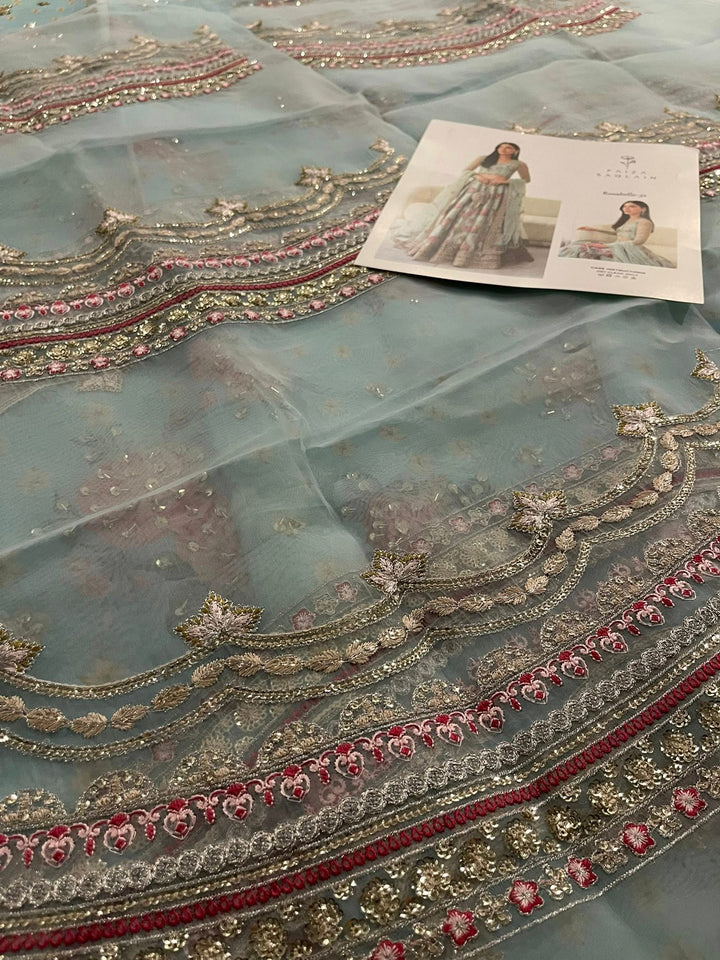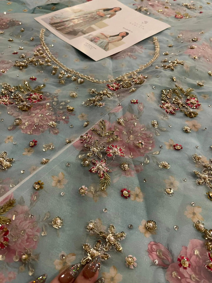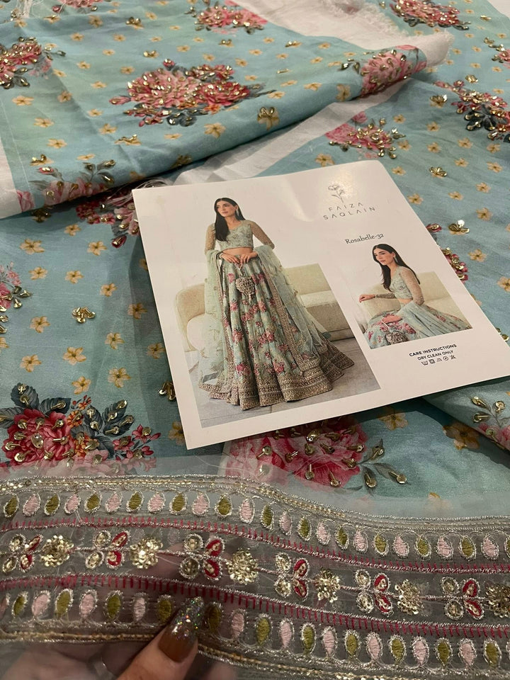 Color: Sea GreenDescription: Marked with refined elegance, Rosabella is an ethereal canvas of craft. Cut from sea green opulent silk, the lehnga features a majestic floral print elevated with resham and zari adornments. Paired with a silk blouse and a delicately embellished net dupatta, this set will shine a spotlight on you at every occasion.