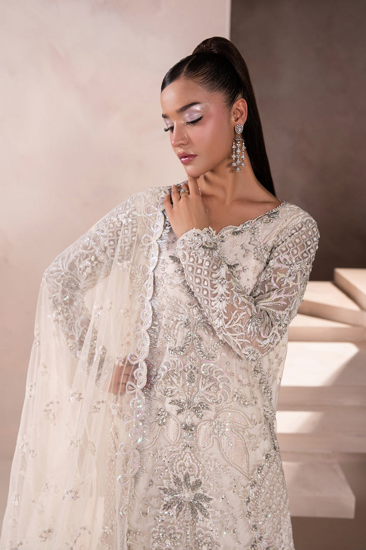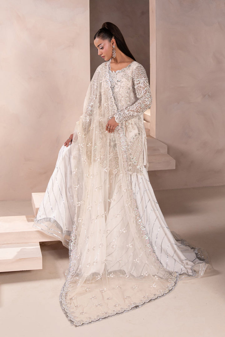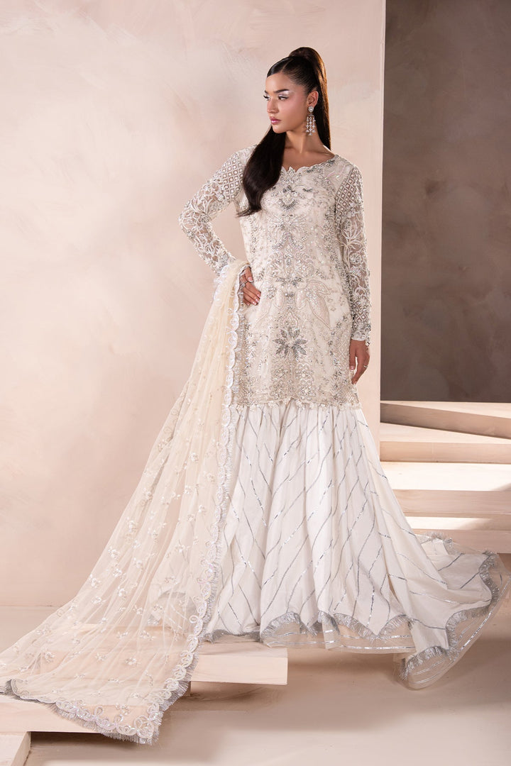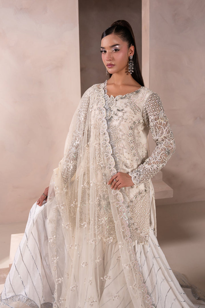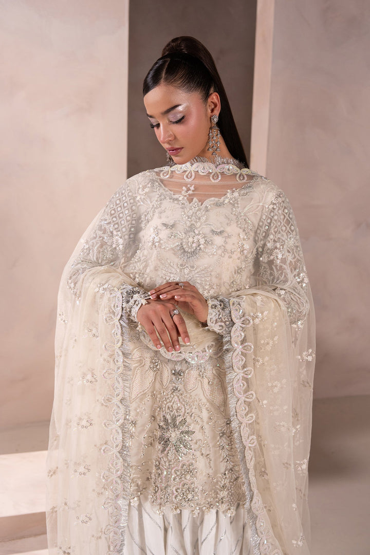 - A Chic Off-White outfit with a short, embellished shirt featuring modern gold and ivory accents. Paired with a wide two-legged Garara and a dusty net dupatta edged with kiran borders and soft embellishments. Understated yet striking with a modern twist.