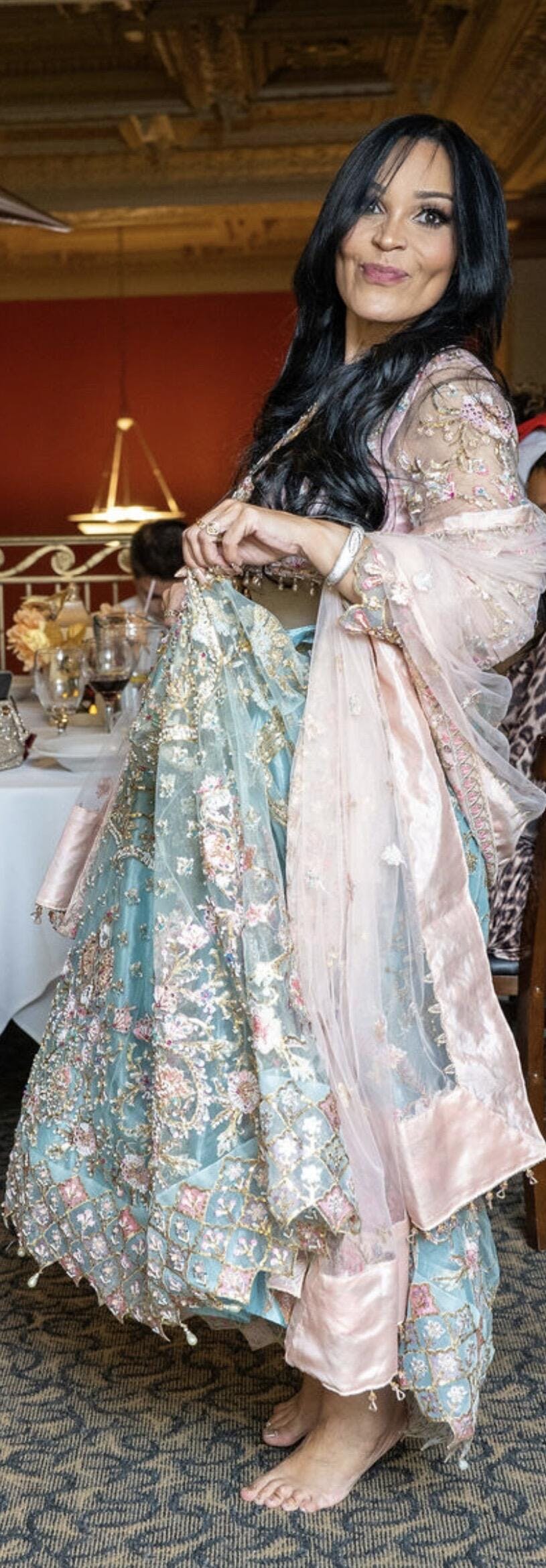- Joli - Inspired by the Rajhistani culture, we bring you the Rajkumari Maxi frock style color blocked in a unique combination of pink and sea green with intricately hand-worked embellished details encrusted with pearls, gotta, dabka, nakshi, crystals, mukaish, pitta and many more. The pink tulle dupata is filled with a booti spray and is decorated with four sided silk borders with heavy pearl tassel details.