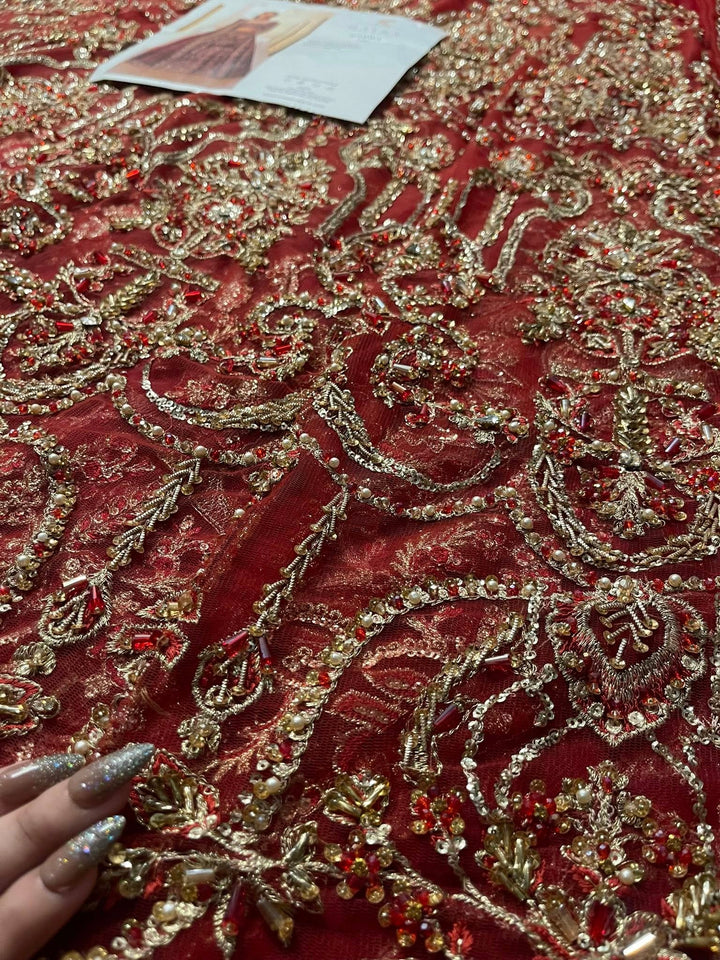 The Zarwa bridal lehenga choli from Maysa Bridal Couture's '24 Collection is a stunning blend of luxury and sophistication. Crafted in a rich, deep red fabric, this masterpiece is adorned with intricate golden embellishments that radiate opulence. The delicate crystal work, combined with elegant dabka and cut dana embroidery, creates a mesmerizing effect that enhances the overall allure of the ensemble. The lehenga's voluminous silhouette, paired with the choli's fitted form, offers a graceful balance of grandeur and modern elegance. Zarwal is a perfect choice for the bride seeking a luxurious, unforgettable look on her special day.