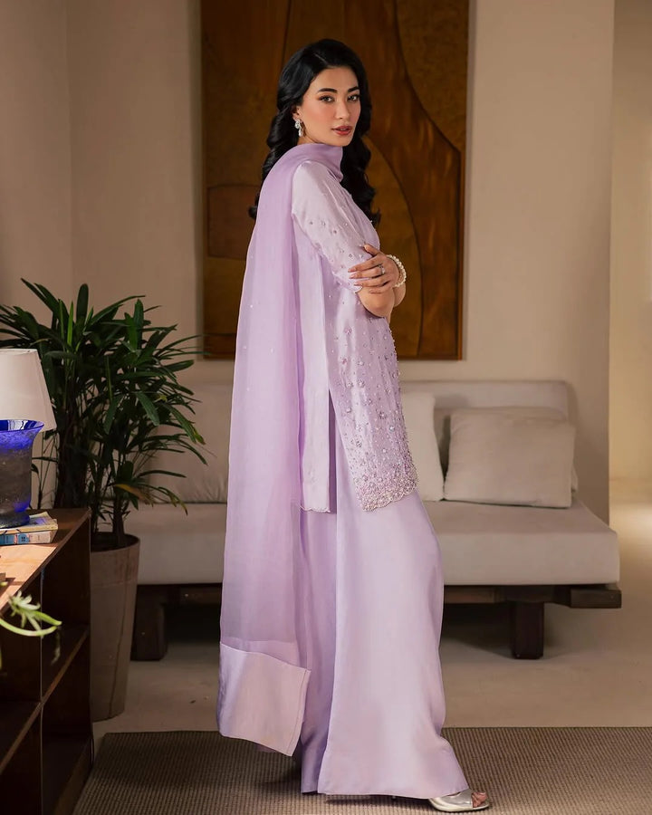 This dreamy lilac Pure Korean Raw Silk ensemble features intricate hand embellishments with sequins and threadwork on a soft, lustrous fabric, paired with fluid palazzo pants and a matching Medium Organza dupatta that exudes understated elegance and modern charm.