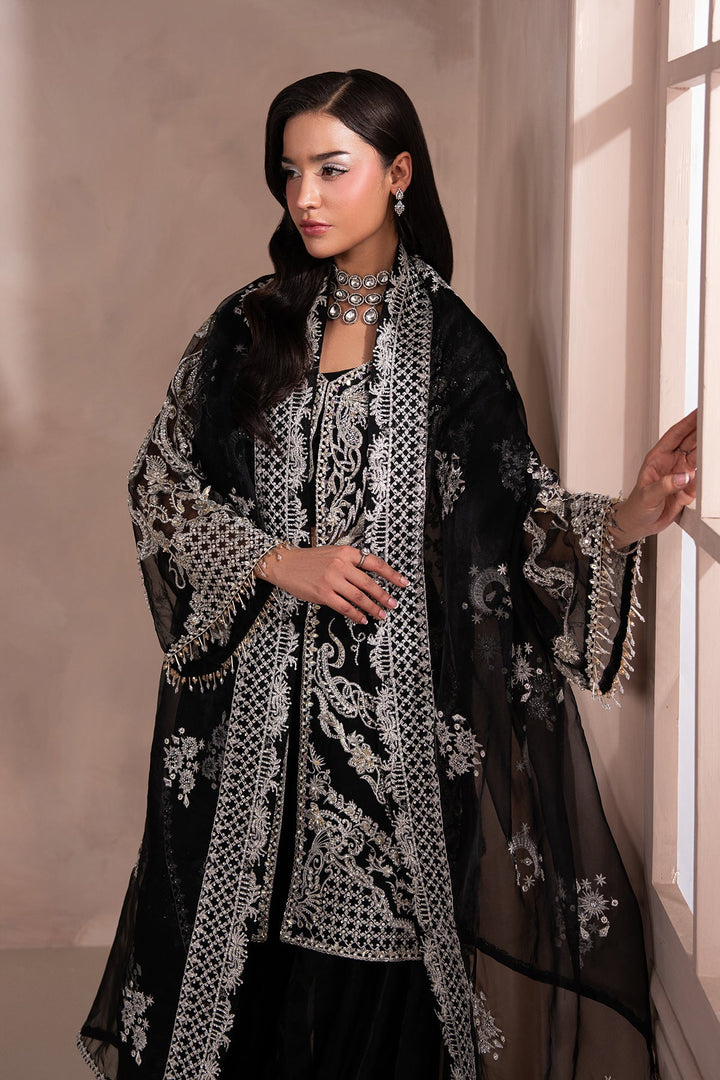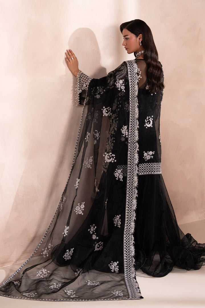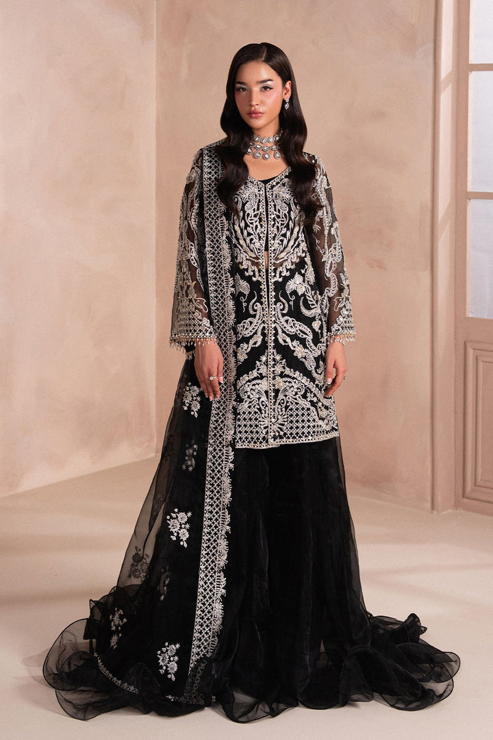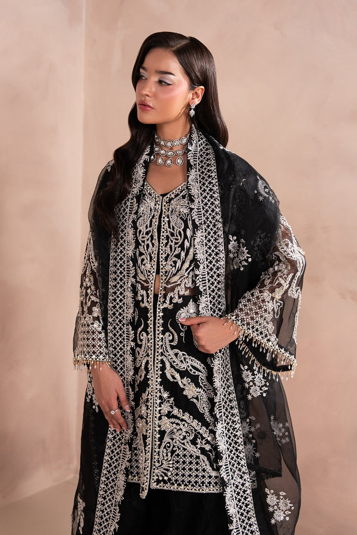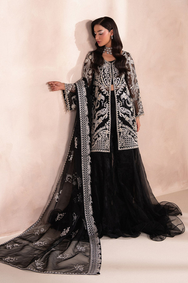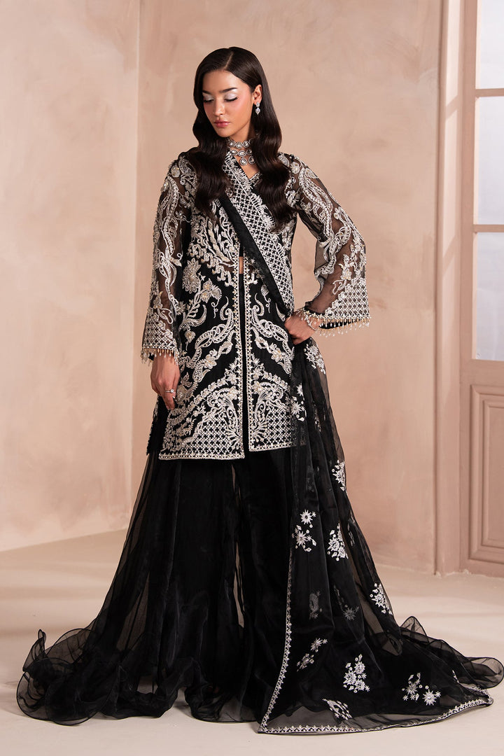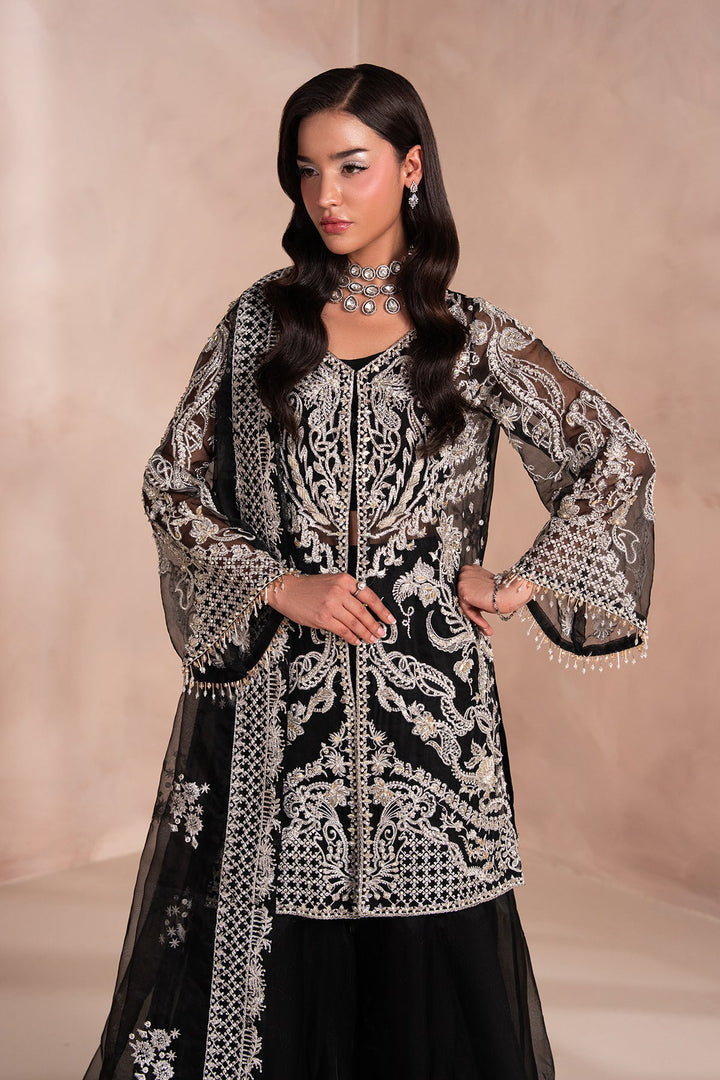 - A Bold and Elegant Black outfit featuring a short, front-open shirt with subtle embellishments, giving it a refined yet modern edge. Paired with a flowing, long two-legged Organza Sharara, The look Balances Structure with Movement.