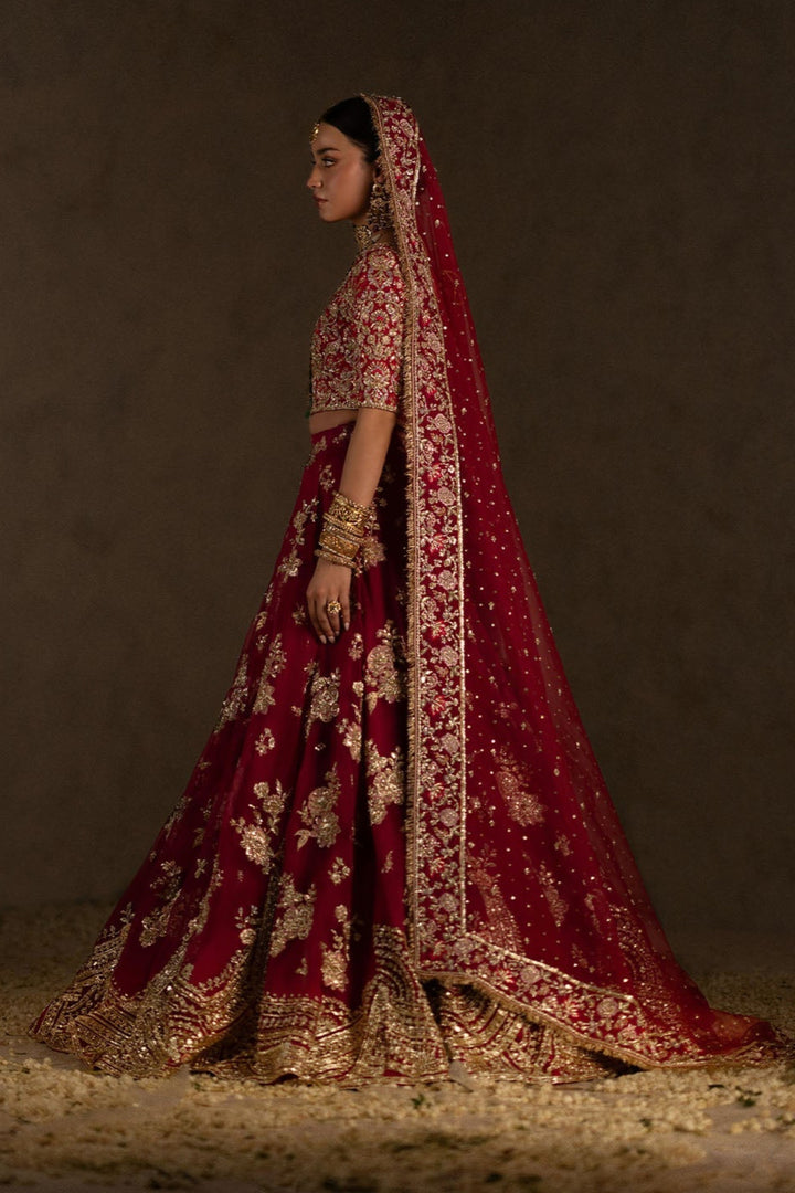 A marsala bridal ensemble featuring a hand-embroidered choli, adorned with delicate pastel tones, intricate zardozi, and sequin work. The printed lehenga boasts a heavily embellished gotta and zardozi border at the hem, complemented by intricately embellished motifs throughout. The floral dupatta is highlighted by a blend of colors and detailed zardozi work, enhanced with an embellished spray and finished with kiran edging.