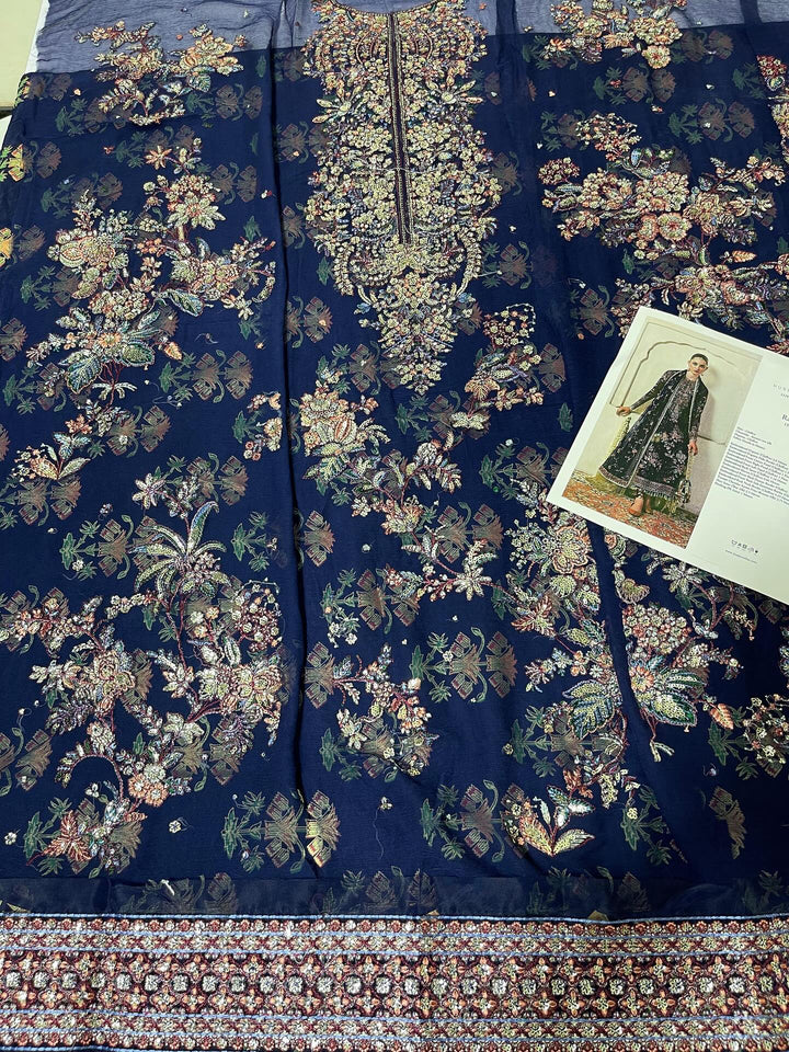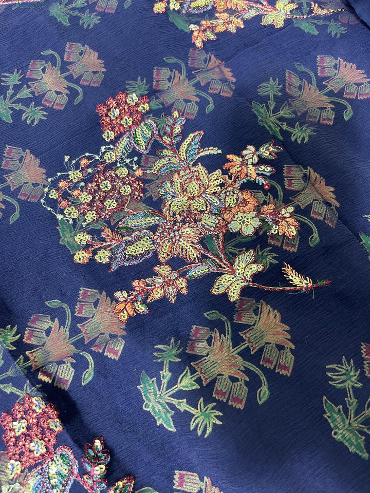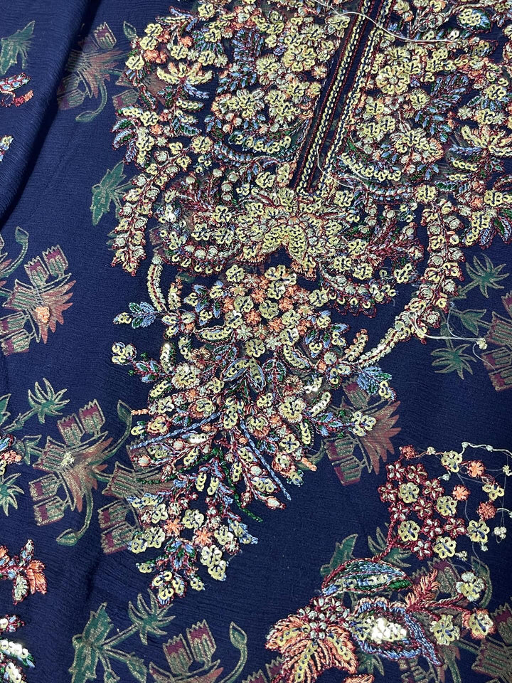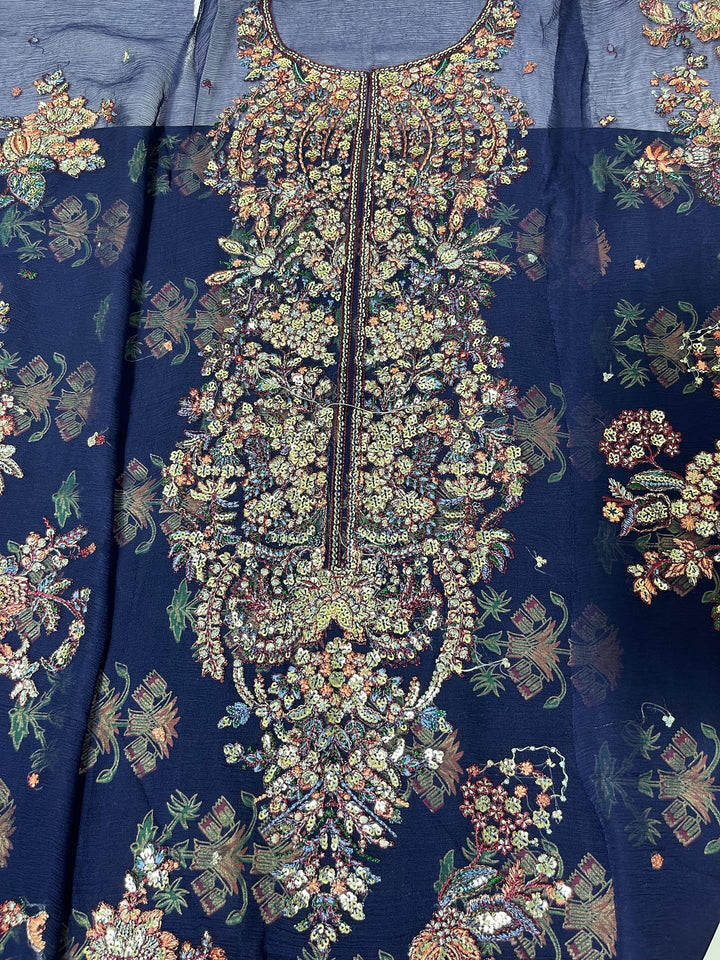 This blue chiffon shirt is adorned with a long embroidered neckline and fully embroidered front daman borders that bring depth to the design. It is paired with a Korean raw silk churidar, creating a refined balance to the richly embroidered shirt. Completing the look is a chiffon embroidered dupatta with delicate embroidery and four-sided borders and embroidered floral jaal with multicolors. This outfit offers a timeless charm with modern elegance, making it suitable for both festive and formal gatherings.