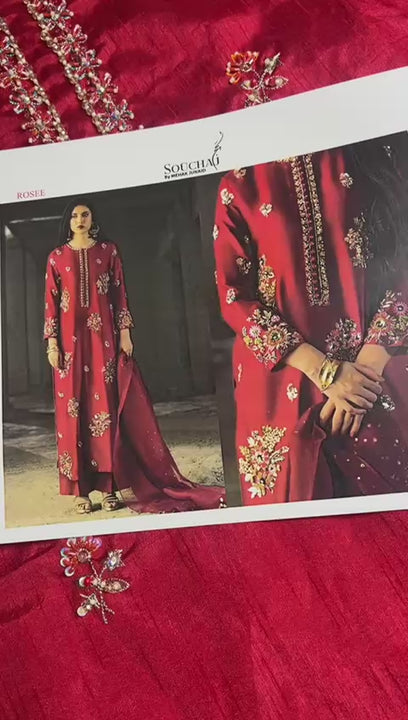 This deep red ensemble radiates timeless elegance with its rich color and intricate embellishments. The long shirt features hand-embellished floral motifs and detailed work along the neckline and cuffs, paired with straight trousers and a flowy organza dupatta. A bold yet classic choice for festive evenings or formal gatherings.