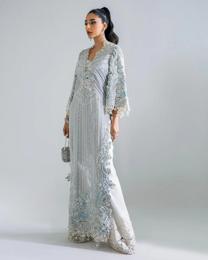 A cascading stream of artistry and intricacy accentuated through a blend of cutwork laces and embroidered precious ornaments, presenting a contemporary take on a timeless classic.