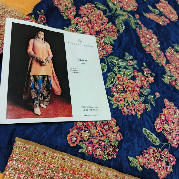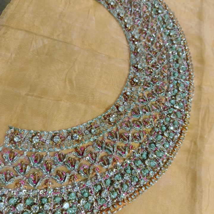 A decent peach raw silk shirt with intricately embellished neckline and sleeves at the ends, it is paired with a raw silk teal blue shalwar heavily embellished shalwar with intricate, dainty details of silver mukaish, silver nakshi, silver sequins, silver dabka, and orange, pink and green buggle beads. It comes with an pistachio organza dupatta with multihead borders on all four sides and sequin chatta all over it.