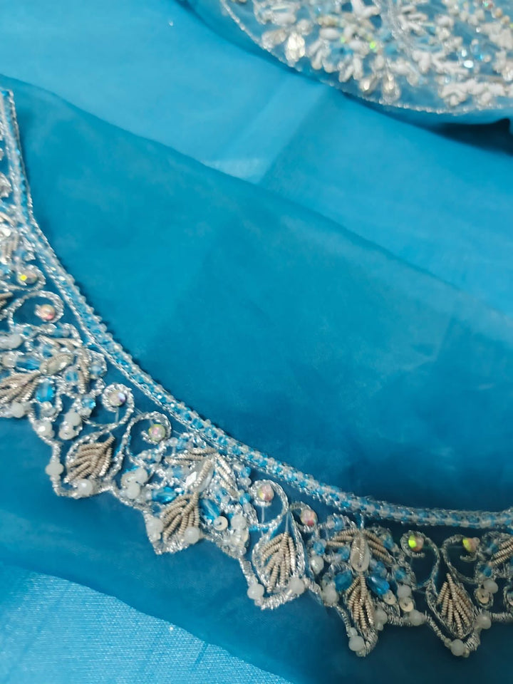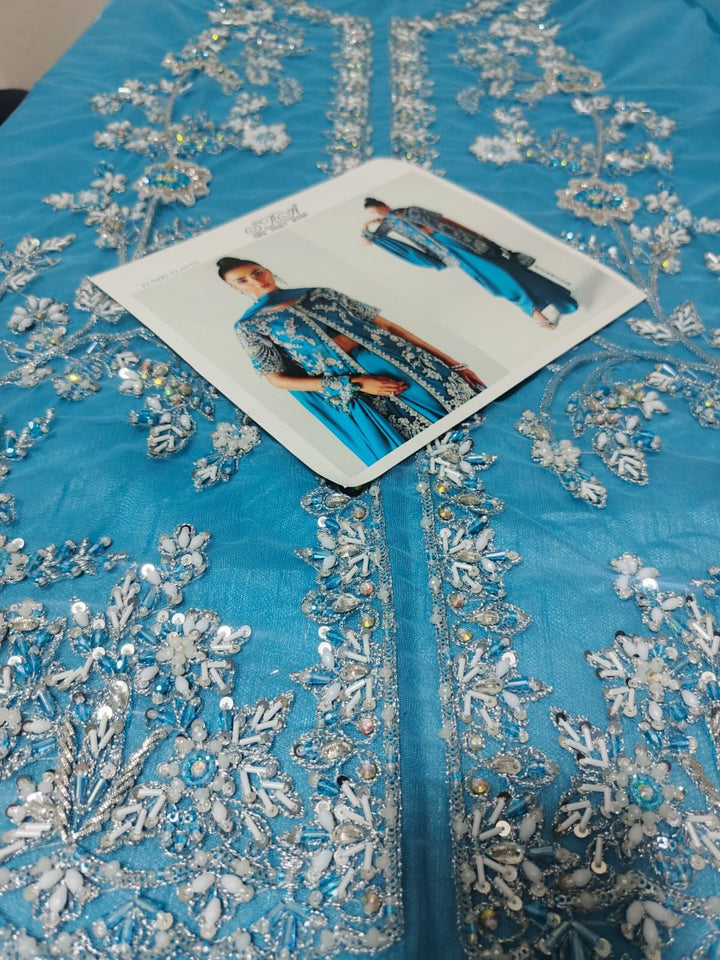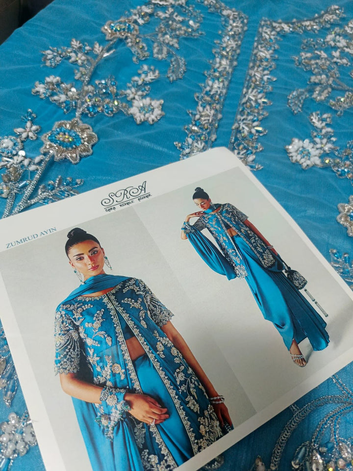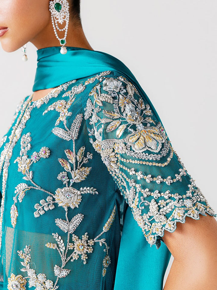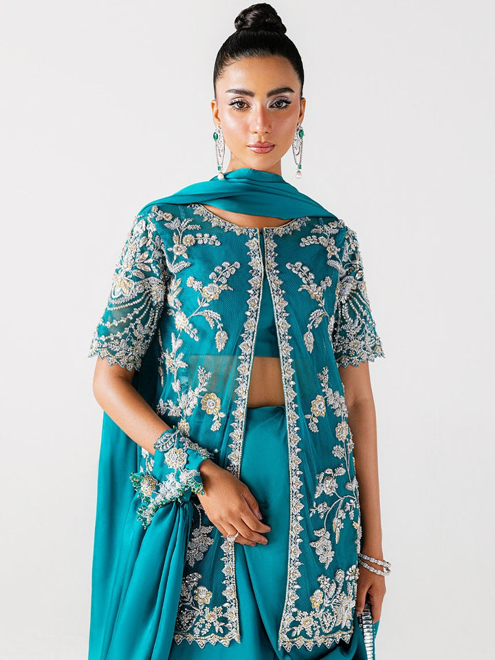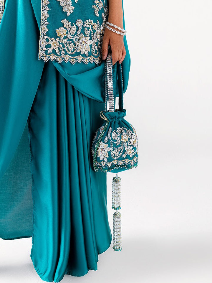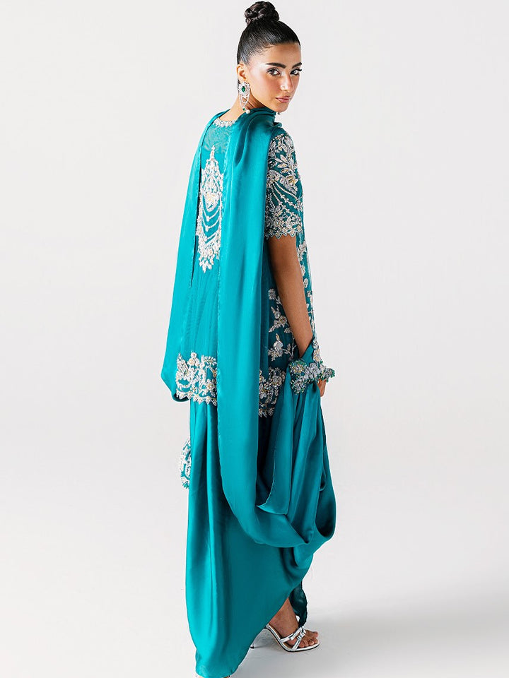 Zumrud Ayin is a ritual of reinvention where tradition collides with couture. A pant-saree draped in luminous turquoise green satin cascades in sculptural folds, creating movement that is both commanding and effortless. The open-front jacket, detailed with silver botanical embroidery and crystal accents, frames the silhouette with regal precision, while the matching embellished potli completes the ensemble with ceremonial intent.