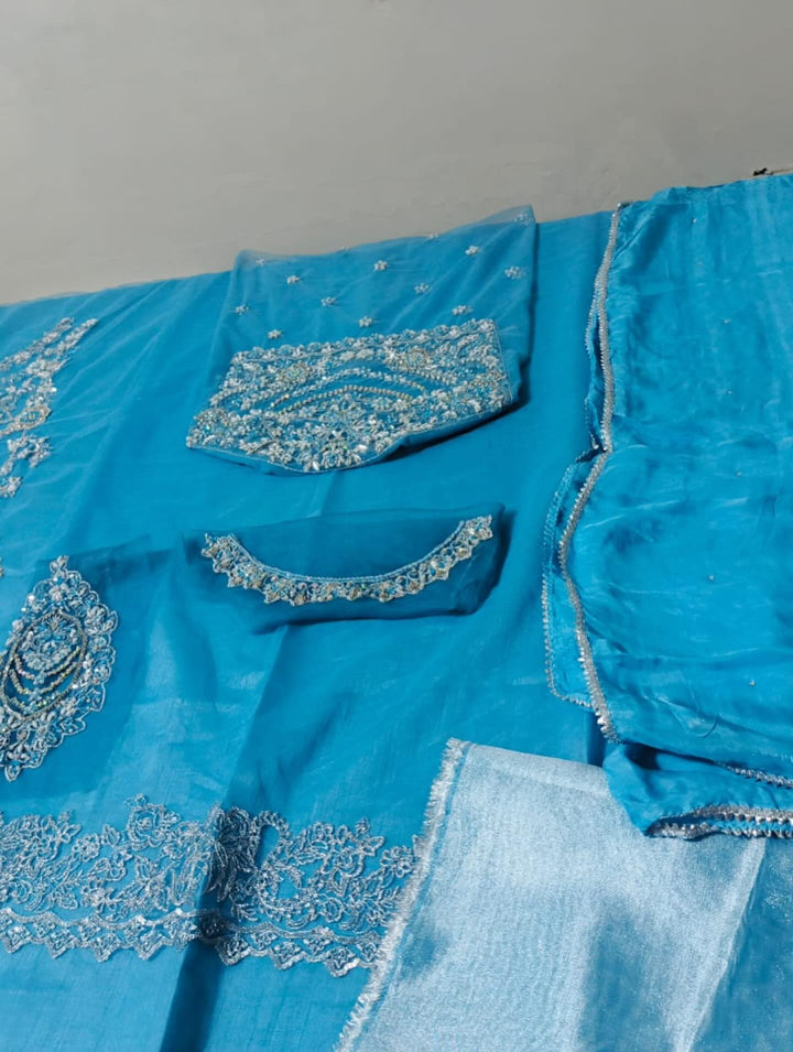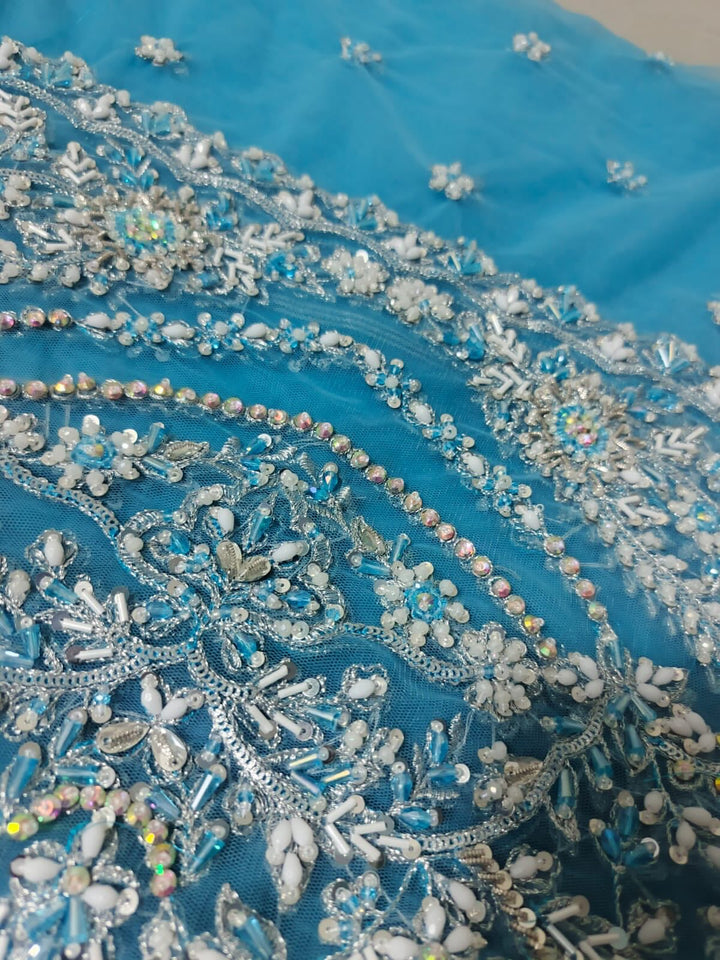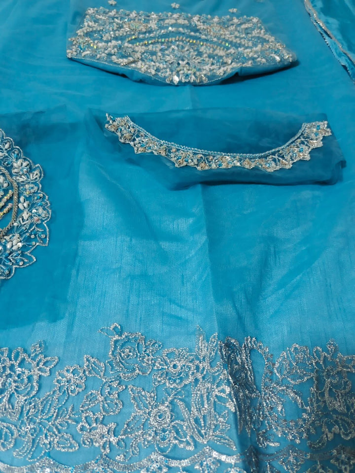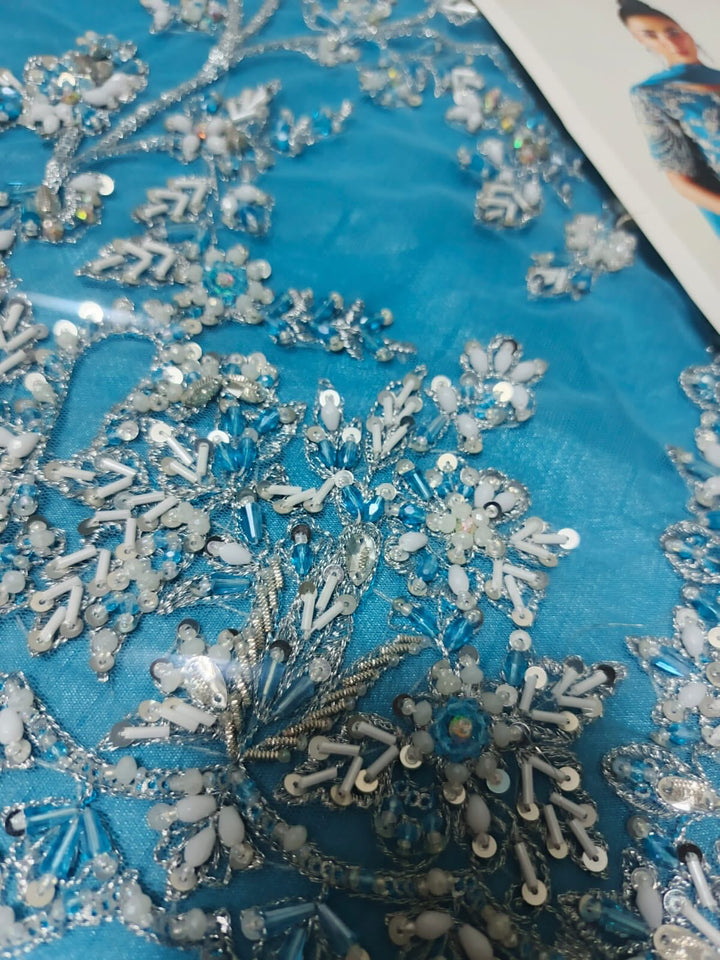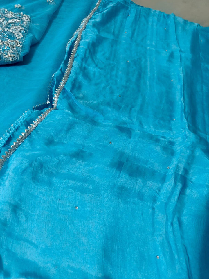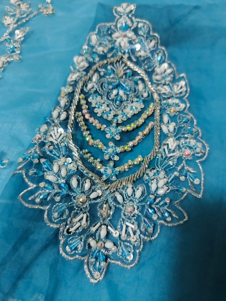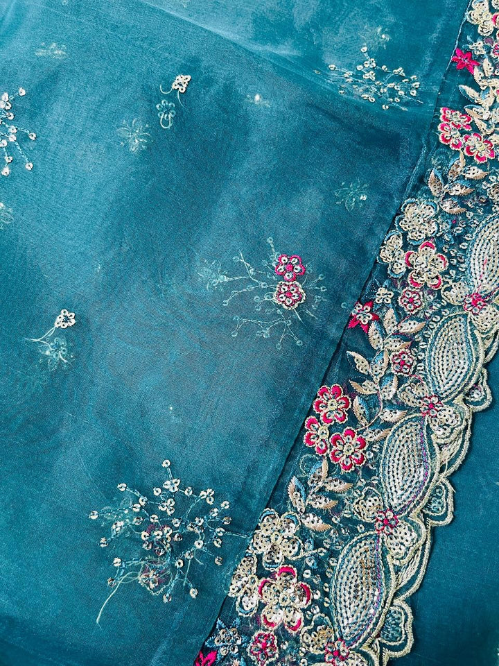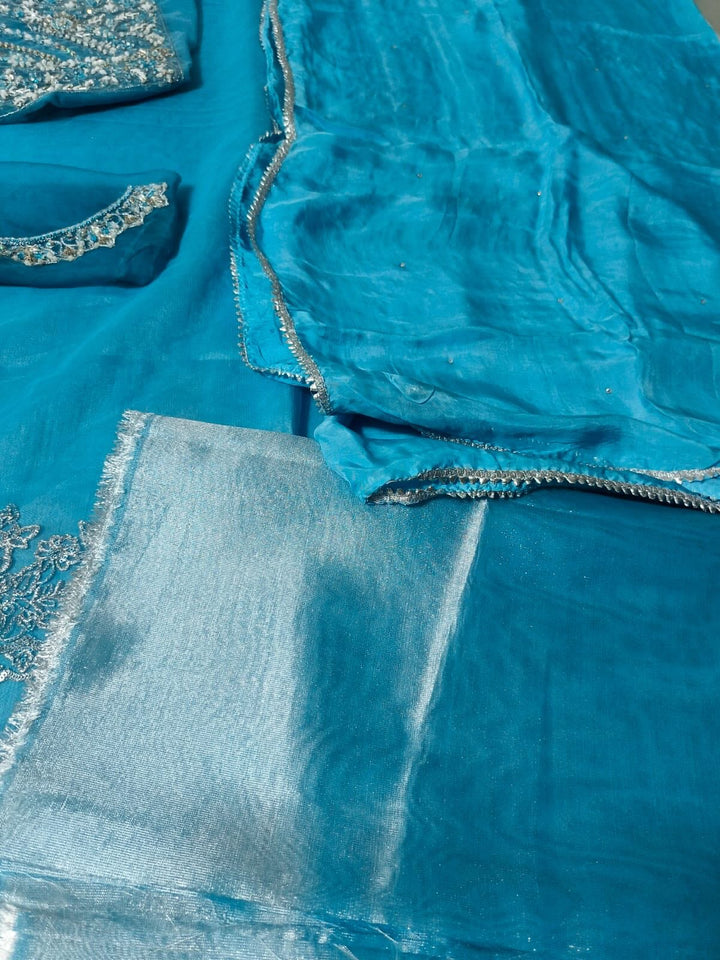 Zumrud Ayin is a ritual of reinvention where tradition collides with couture. A pant-saree draped in luminous turquoise green satin cascades in sculptural folds, creating movement that is both commanding and effortless. The open-front jacket, detailed with silver botanical embroidery and crystal accents, frames the silhouette with regal precision, while the matching embellished potli completes the ensemble with ceremonial intent.